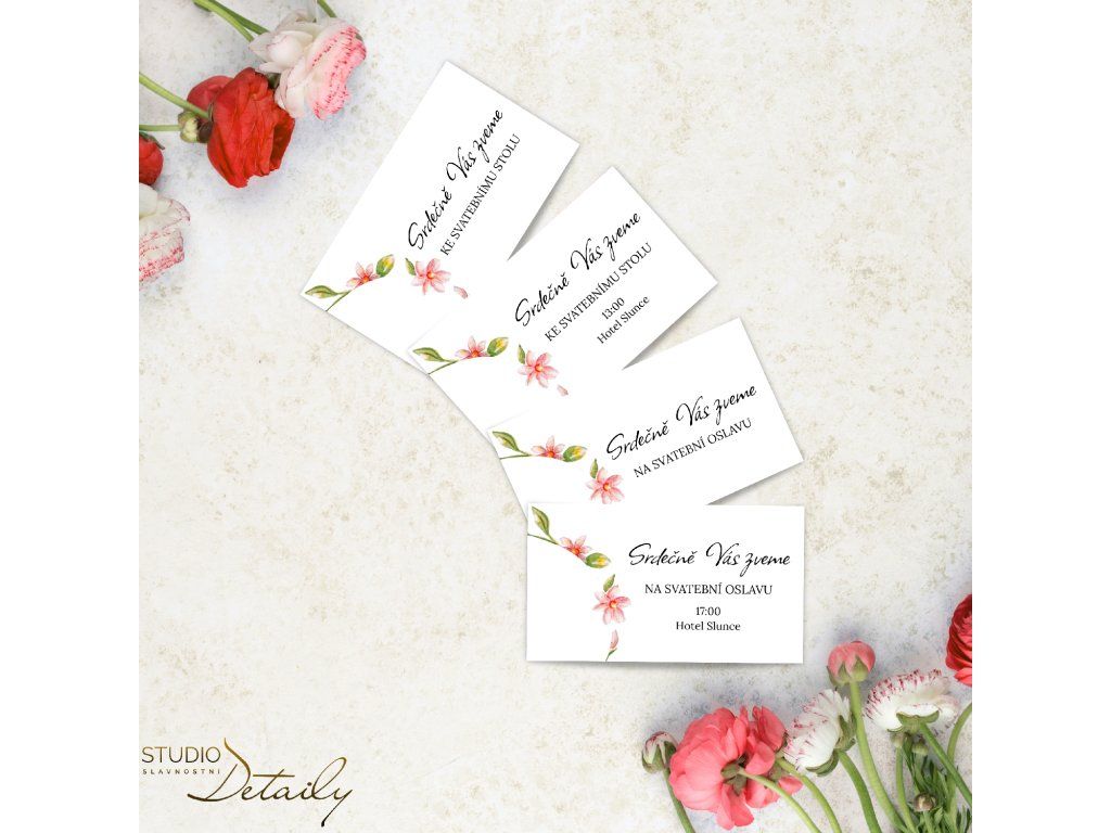 Ke svatebním pozvánkám si můžete vybrat svatební oznámení, jmenovky a mnoho dalších tiskovin sladěných v jednotném stylu.
